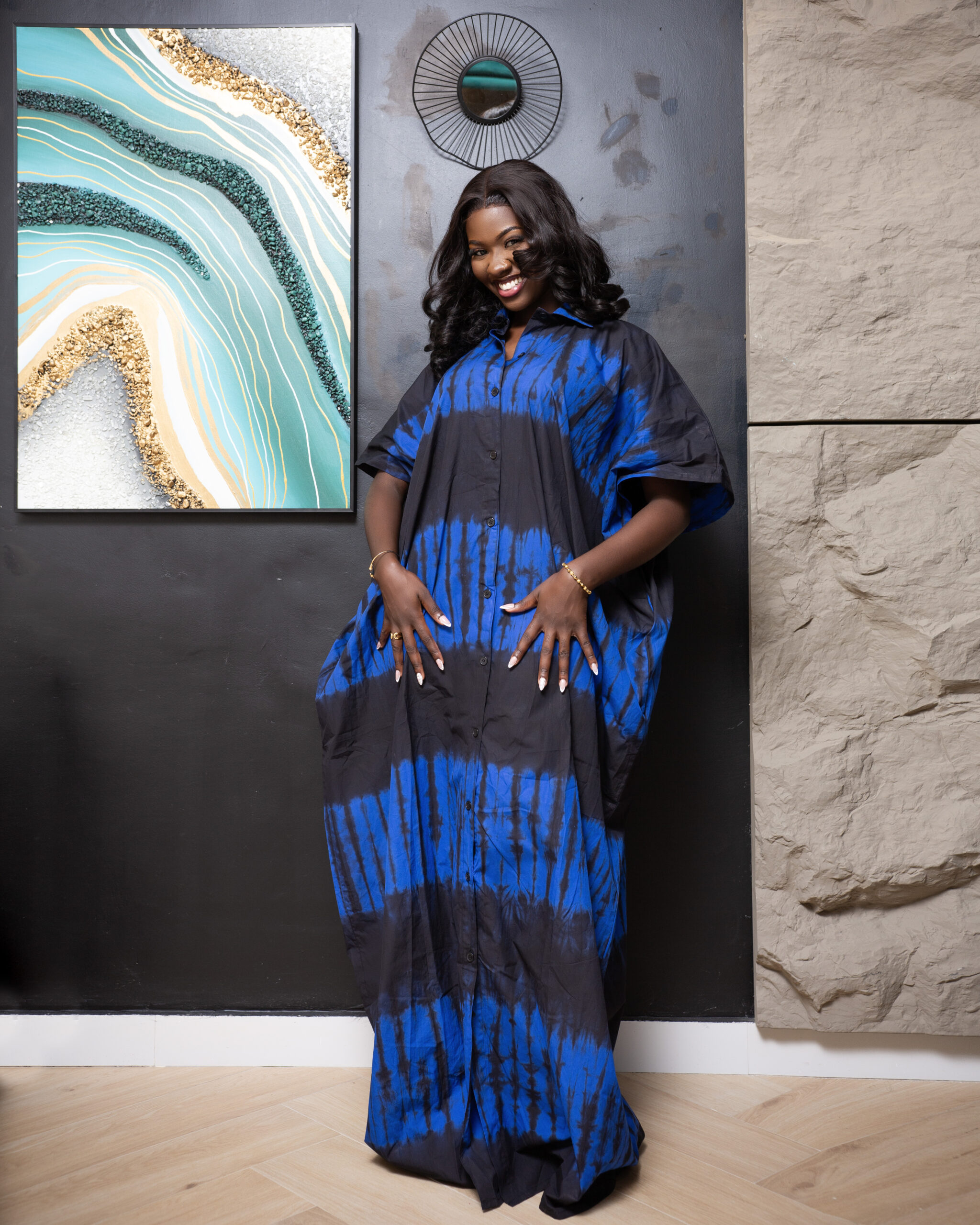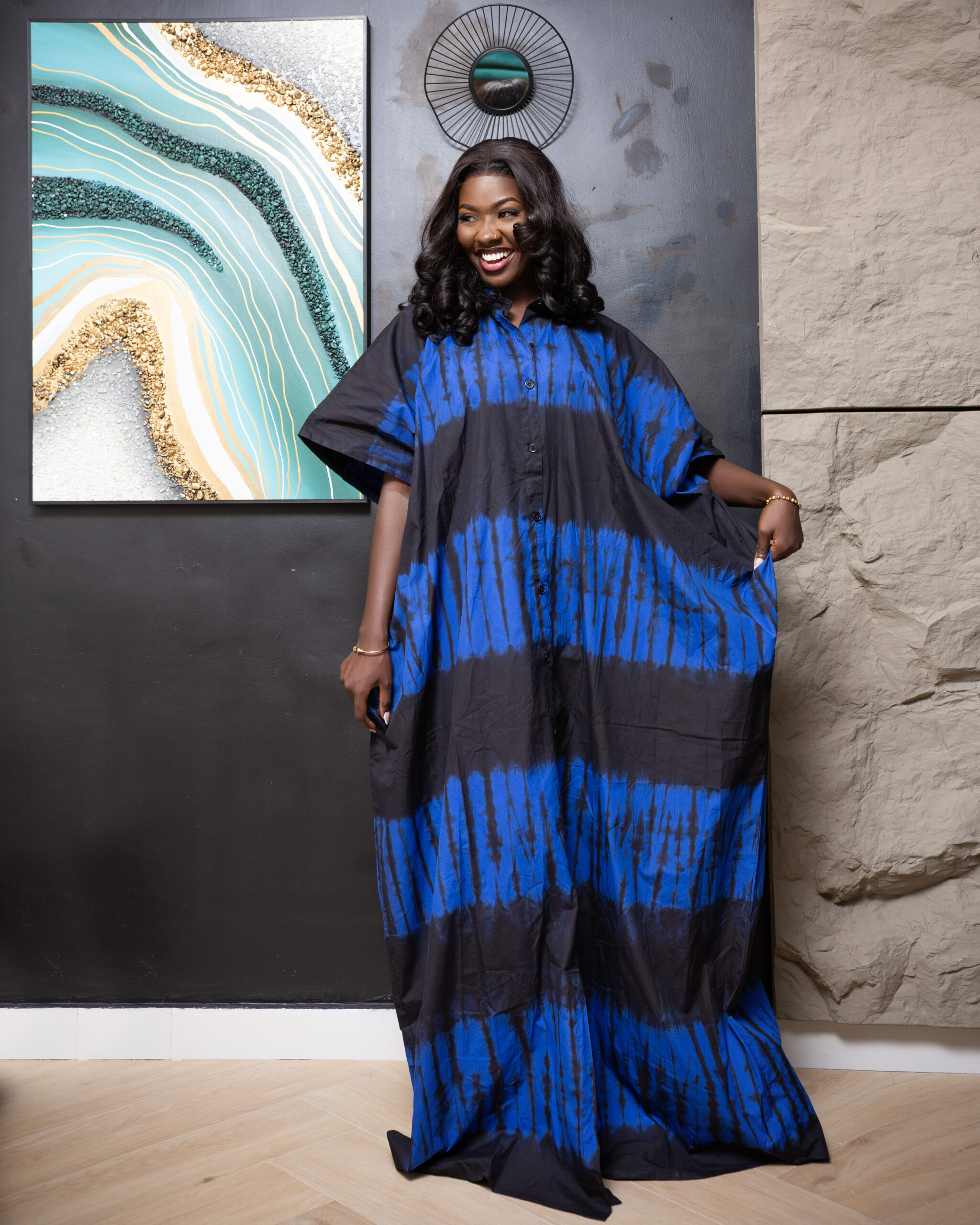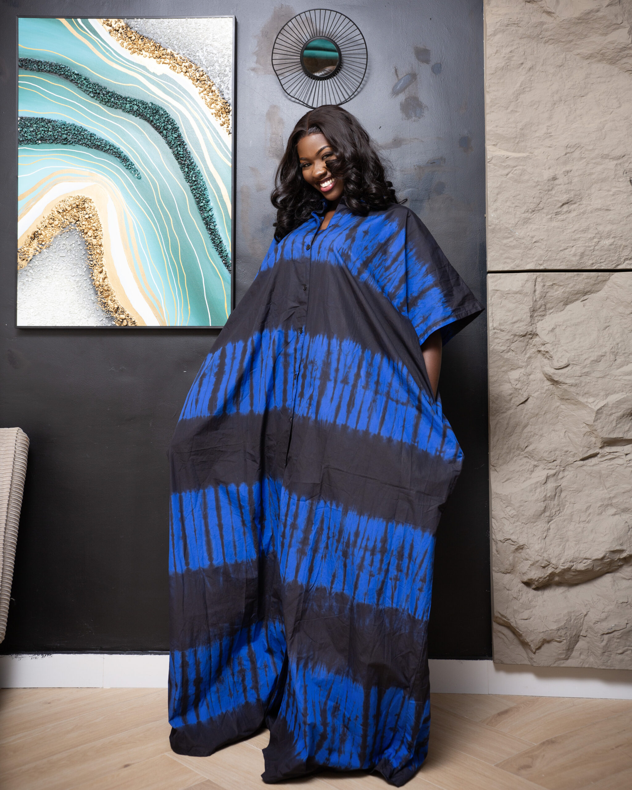 Ce boubou bleu en tissu tie and dye séduit par son style à la fois traditionnel et moderne. Sa coupe fluide assure un confort optimal, tandis que les poches discrètes sur les côtés ajoutent une touche pratique et décontractée. Une pièce idéale pour allier élégance et aisance au quotidien.